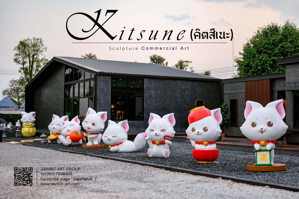 ZAMRIT ART GROUP | KITSUNE Sculpture Commercial Art ประติมากรรมรูปปั้น "Kitsune คิตสึเนะ" หรือจิ้งจอกมงคล มีทั้งหมดจำนวน 9 ตัว จิ้งจอกแต่ละตัวได้ถูกออกแบบให้มีเอกลักษณ์เฉพาะตัว เหมาะสำหรับตกแต่งสถานที่ เช่น บ้าน สวน บริษัทหรือสร้าง Landmark ประติมากรรมจิ้งจอกทั้ง 9 ตัว ได้ถูกติดตั้ง ณ สำนักสักยันต์เศรษฐีอริยทรัพย์ อาจารย์โอ ชากังราว จังหวัดกำแพงเพชร